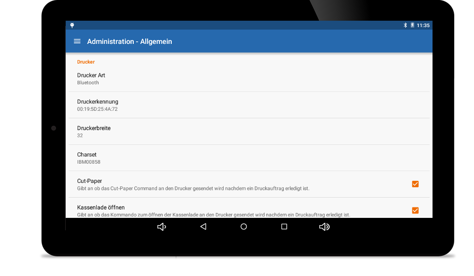 Der Bondrucker ist Voraussetzung für den Druck und die Aushändigung des Belegs. Das ist gesetzlich über die Belegerteilungspflicht vorgeschrieben. bonario unterstützt ESC/POS-fähige Drucker. Die Anbindung kann per USB (beachten Sie die Anzahl der USB-Steckplätze an Ihrem Tablet) oder drahtlos per Bluetooth erfolgen.