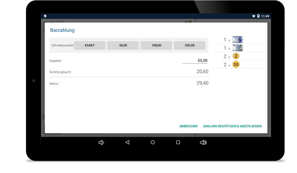 Die Lizenz und die gewünschten Geräte können als Komplettlösung gemeinsam bestellt werden. Für ein gesetzeskonformes System werden mindestens ein Tablet und ein Bondrucker benötigt. Außerdem können eine automatische Kassenlade und ein Barcode-Scanner an die App angebunden werden.